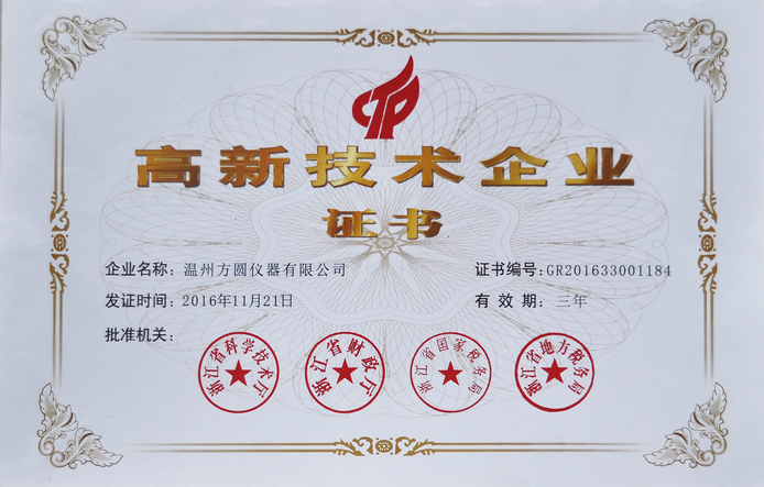 熱烈慶祝溫州方圓儀器有限公司順利獲得浙江省高新技術(shù)企業(yè)證書